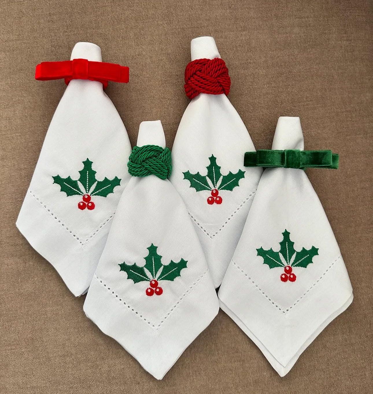 Guardanapo branco em ponto ajour com bordado de de cereja natalina.