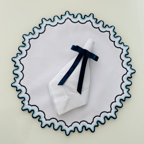 Tecido: Poliester imperméavel branco com bordado em tons de azul