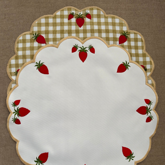 Tecido impermeável branco com morangos e dupla face em vichy bege e branco